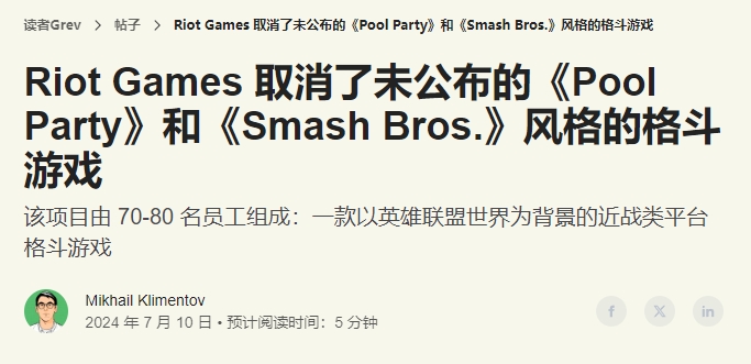 就在近日,又有拳头关停项目的新消息传出——前华盛顿邮报记者Mikhail Klimentov在其个人网站上爆料称,拳头在今年5月底取消了一款代号《Pool Party》的“类任天堂大乱斗”项目的开发。知情人士称,这款游戏原本将采用拳头自家的《英雄联盟》IP,在项目关停时有约80名员工参与研发。